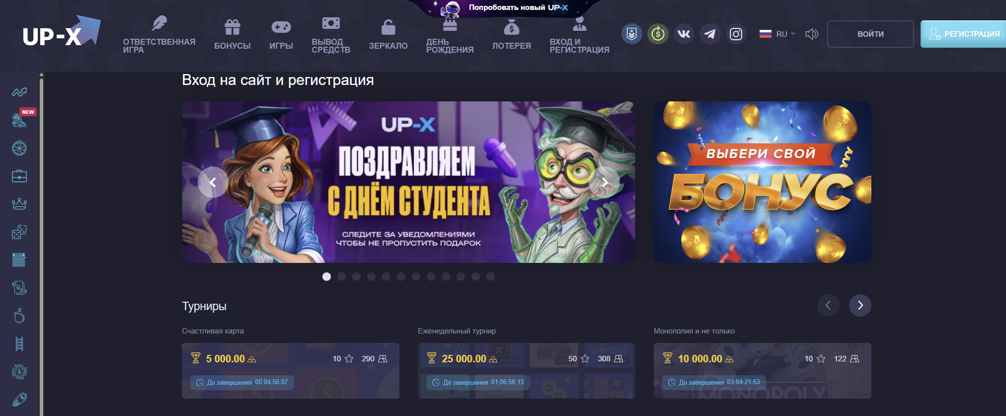 Онлайн казино Up X (также известное как UpX казино, Икс Ап или Casino Ап Икс) стало одной из самых востребованных игровых площадок среди россиян и жителей СНГ. Благодаря современному софту, щедрым бонусам и стабильному доступу даже при блокировках, платформа быстро завоевала доверие игроков. В этом обзоре мы подробно расскажем, про вход на официальный сайт, где найти рабочее зеркало, как пройти регистрацию в UpX Casino онлайн и безопасно играть на деньги.